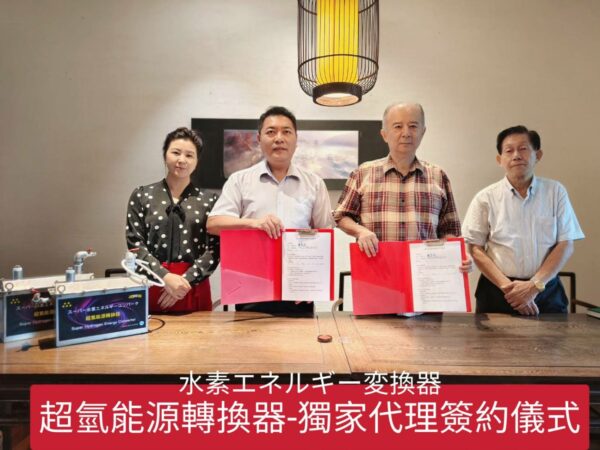 台灣水晶灣股份有限公司董事長潘品睿(左二)與超氫能源轉換科技鄭董事長,代表雙方完成簽署,標誌台灣車輛能源轉型邁向關鍵里程碑。圖/台灣水晶灣股份有限公司提供 台灣