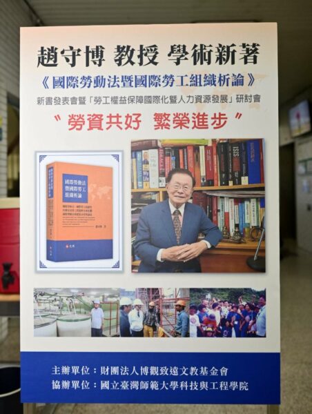 前總統府資政、前行政院勞委會主委趙守博教授,於近日(2026年1月31日)假台北市國立台灣師大進修推廣學院舉辦其最新學術著作《國際勞動法暨國際勞工組織析論──國際勞動法、國際勞工組織、暨相關重要勞工問題與全球化之國際勞動法規範的分析與論述》的新書發表會,共有臺大醫院李源德前院長、國立政大前校長和行政院陸委會前主委張京育、前監察委員和實踐大學董事長謝孟雄、全國商業總會前理事長張平沼、前勞委會主委王如玄、前農委會主委陳保基、審計部前審計長林慶隆、國立中山大學前校長劉維琪、前法務部長曾勇夫、前大法官黃虹霞……等政、商、學界及相關各界人士暨工商企業負責人百餘人受邀參加,現場貴賓雲集,熱鬧非凡。
