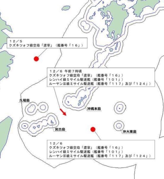 12月6日星期六下午,沖繩本島東南方公海上空,日本航空自衛隊執行應對任務的戰機,被中共軍機多次進行雷達照射,事後中方表示「自衛隊機干擾中國軍機飛行」,而日方也表示「自衛隊機在保持安全距離的情況下執行任務」「這次雷達照射是超出航空器安全飛行必要範圍的危險行為」。據了解在6日雷達照射事件的同時,中共航空母艦「遼寧號」還在沖繩本島與南大東島之間的海域進行艦載機起降活動,這是首次在該海域確認有艦載機起降,而持續至7日,遼寧號沿著沖繩本島東側的南大東島向東北前進,行至鹿兒島縣喜界島東方約190公里海域,其艦載機在兩天內的起降次數累積超過100次。