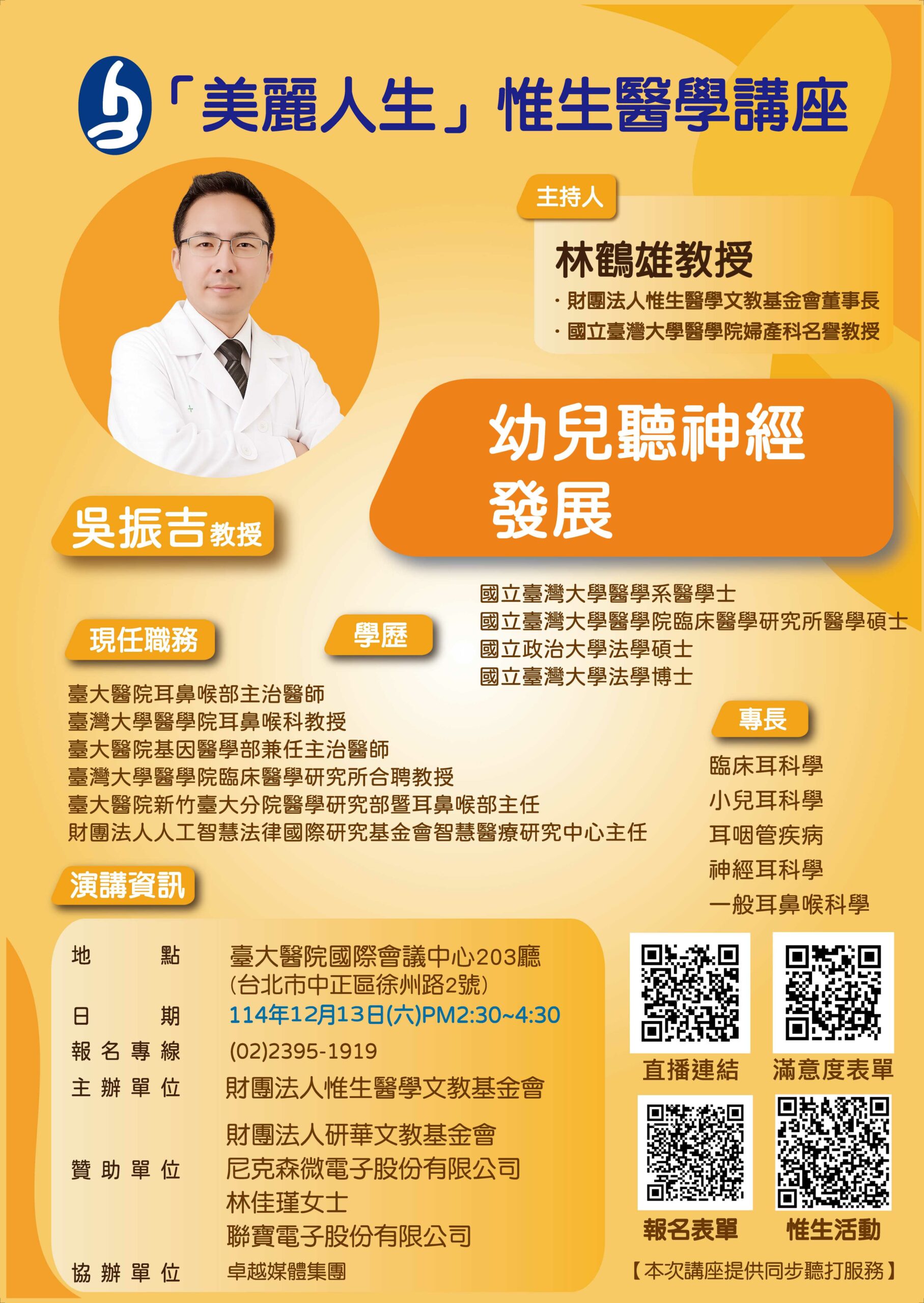 幼兒在語言黃金期若缺乏良好聽覺刺激,將影響語言表達、理解能力、情緒與大腦發展。為了協助家長與教育現場及早掌握孩子的聽力狀況,惟生基金會特別邀請 臺大醫院耳鼻喉科 吳振吉教授,帶來一場清楚易懂的「幼兒聽神經發展」講座。