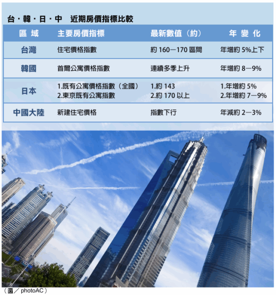 日本房地產市場,持續受惠於長期低利率環境。二○二五年日本既有公寓價格指數約一四三點,東京地區則超過一七○點,顯示核心城市仍是價格成長的主要引擎。