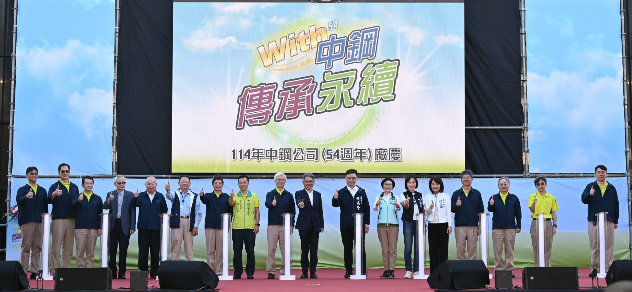 中鋼董事長黃建智(左9)、總經理陳守道(左7)、執行副總經理鄭際昭(左3)帶領的經營團隊,邀請前來參加活動的經濟部次長賴建信(右9)、立法委